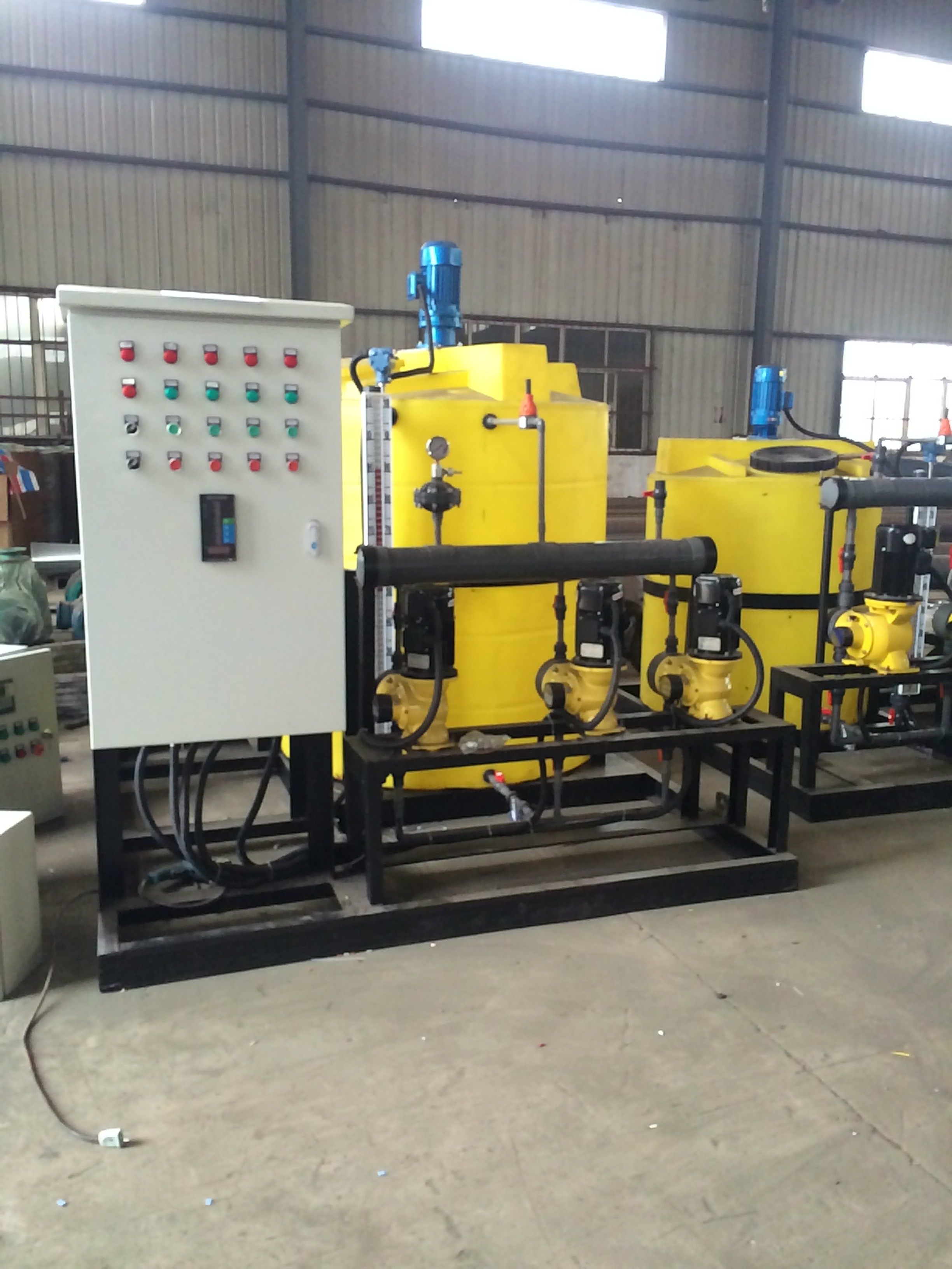 加藥裝置,采用的是機電一體化結構形式,從安裝上可分為固定式和移動式(推車式),每種形式的加藥裝置均配有攪拌系統(tǒng)、加藥系統(tǒng)和自動控制系統(tǒng)。幾個固定式撬裝可組合成一個整體,加上變頻控制系統(tǒng),可實現(xiàn)就地控制、遠程自動控制、手動和自動相互轉換加藥。具有結構緊湊,體積小、噪音低、工作平穩(wěn)、安裝簡單、操作使用方便等優(yōu)點。